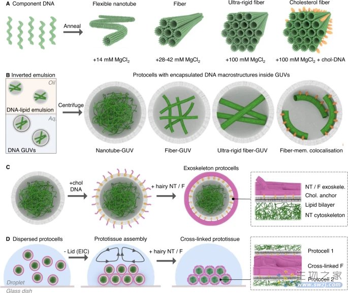 研究人员证明了五个寡核苷酸可以退火成纳米管或纤维,其可调整的厚度和长度跨越四个数量级。这些结构被整合到细胞样囊泡内,并被包裹在囊泡的外部——作为细胞骨架(在细胞内)发挥作用。研究人员发现,这些结构可以稳定囊泡,降低它们破裂的几率。
